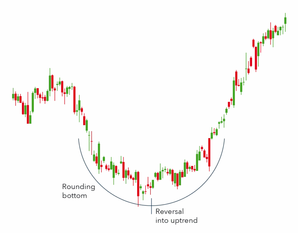 Afterwards, the bullish reversal occurs when the price is in a downward trend and a rounding bottom forms before the trend reverses and continue upwards.