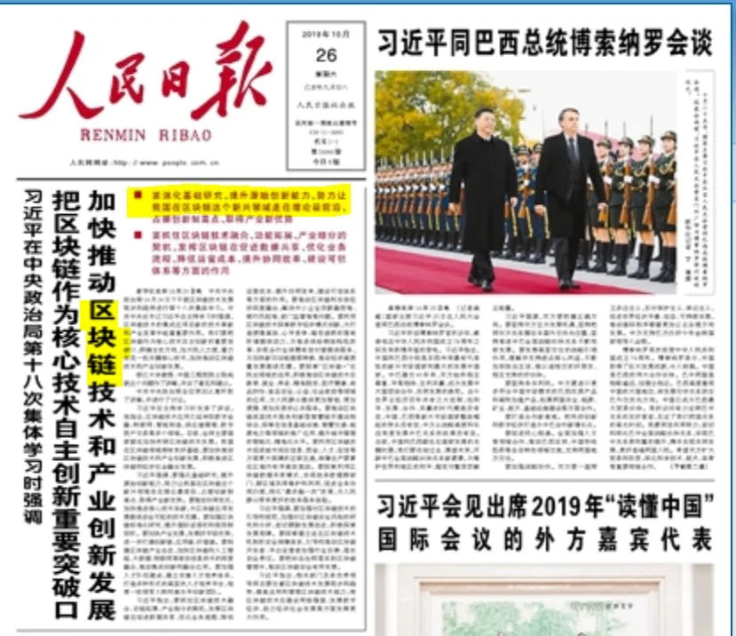 China has start a country wide initiative to rapidly adopt Blockchain Technology and ‘urgently’ develop use cases. China’s President Xi Jinping personally appealed for a greater urgency to develop blockchain in-front of the Communist Party of China Central Committee. This sentiment was echoed in by state media People’s Daily published a front page article on “Placing Blockchain as one of the countries core initiatives, with a target on key breakthroughs“. On top of this, national TV station CCTV-2 had various news segments dedicated to discussion blockchain technology – with a key emphasis that Blockchain, not Bitcoin is China’s key focus.