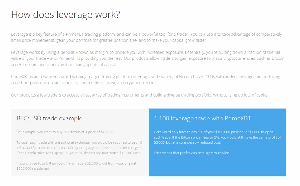 Prime XBT is a cryptocurrency trading platform that offers a user-friendly interface and a wide range of trading options. It is a secure and reliable platform that allows users to trade Bitcoin, Ethereum, Ripple, Litecoin, and other cryptocurrencies. The platform also offers margin trading with up to 100x leverage, and a variety of order types, including limit, market, and stop orders. Prime XBT also provides a range of educational resources to help traders understand the markets and make informed trading decisions. With its competitive fees and low minimum deposits, Prime XBT is an ideal choice for both beginner and experienced traders.