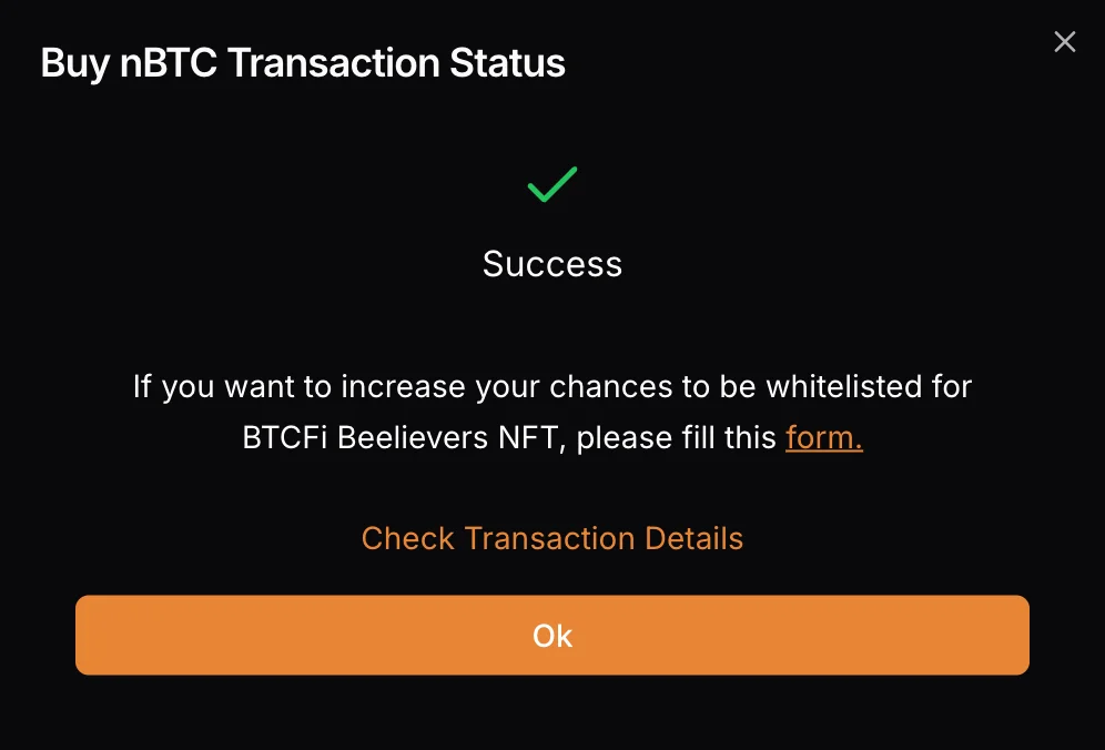 - After making your first NBTC swap transaction, complete the application form for the BTCFi Beelievers NFT whitelist.