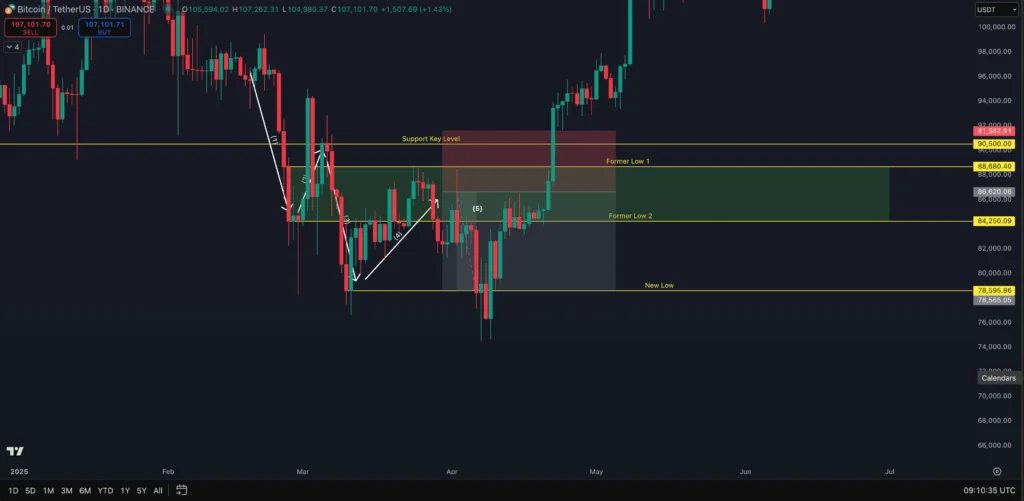 - DCA entry from former low 2 to former low 1 (shown in the green box) and place stop loss above the $90,500 key level, targeting the new low or previous key levels below