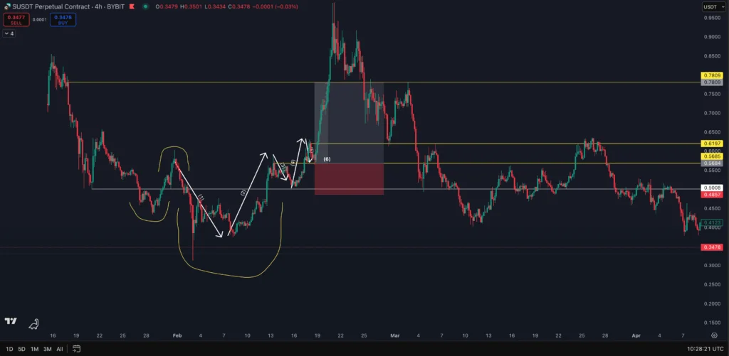 Take for example Sonic’s price action during the period of January to February 2025 (figure 5). $0.5008 was a significant key level for $S acting as both support and resistance in January. As you can see, there were multiple deviations that occurred where price action was indecisive, hence why deviations are risky. Selecting the right one to trade requires waiting for confirmation. The sequence of the long confirmation setup off of the deviation is as follows: