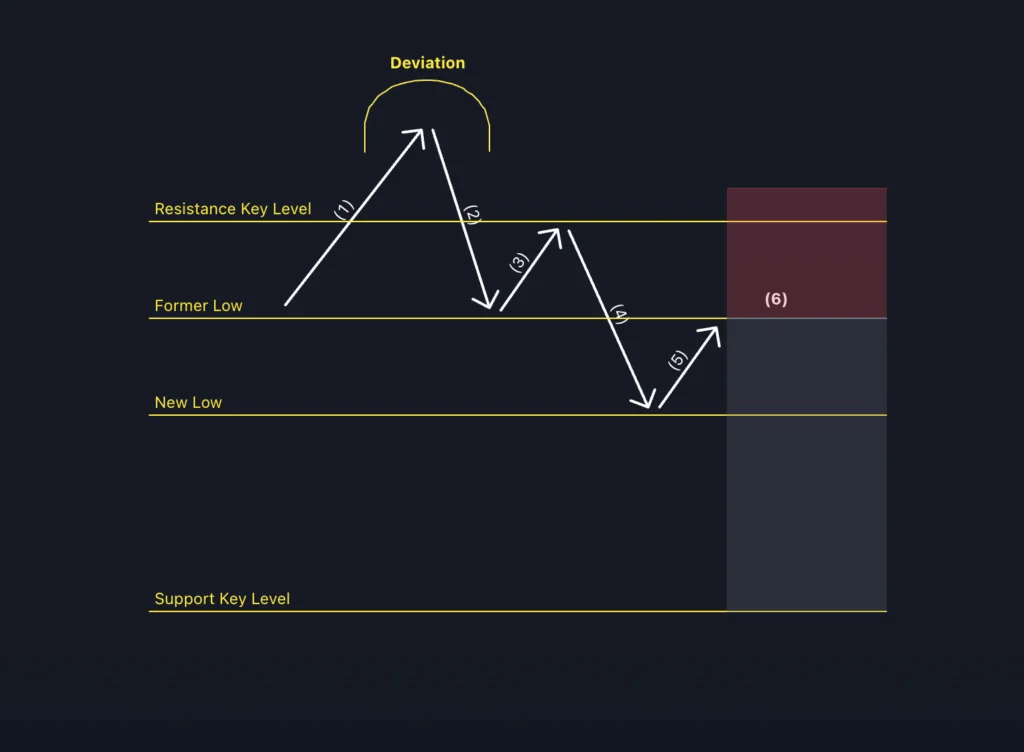 A deviation occurs when price breaks a key level but fails to confirm with a retest, new high/low, and subsequent retest, often forming a semicircle pattern that signals indecision. This leads to a reversal, trapping traders who enter too early. Deviations are generally risky because price can move very quickly in either direction. However, deviations can still be traded if price distributes slowly.