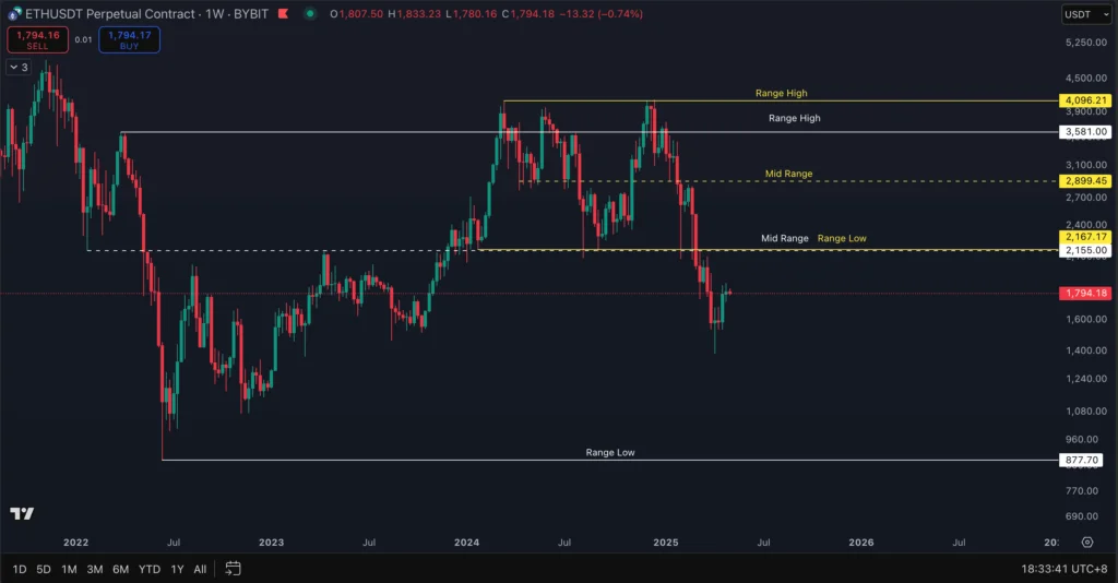 From January 22, 2024 to March 3, 2025, ETH was trading in a range between $2,167.17 and $4096.21. For the longest time, the range low held strongly as an HTF support – price had bounced sharply from the range low 3 times. But on March 9, 2025, price has completely broken below the range low and failed to reclaim it the following week. This means the yellow-lined ranges are no longer in play.