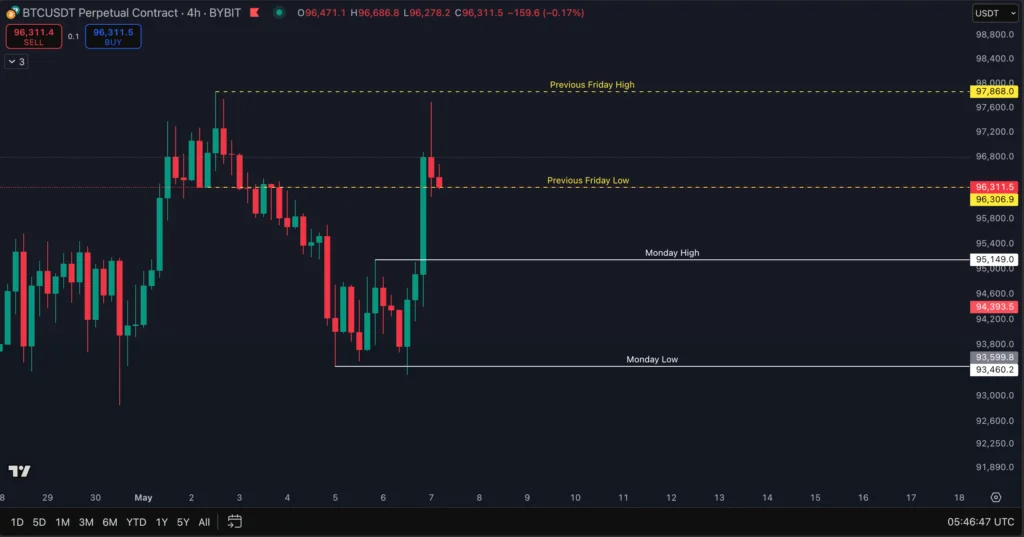 - Friday Levels as a Range: The Previous Friday High ($97,868.0) and Low ($96,306.9) form a range that price often respects. On May 2, the price reached $97,868.0 but rejected sharply, dropping to $95,500.0 by May 3. This rejection confirms the Friday High as a strong resistance. The price then consolidated near the Friday Low ($96,306.9) on May 4, showing that this level acted as support during the decline.