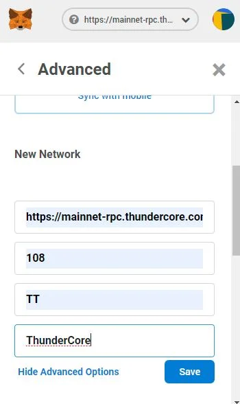 - Get ThunderToken (TT): You can get tokens from the Metamask browser extension. Click on the drop down menu and select “custom RPC”. Go to “new network section” and select “advanced option”.