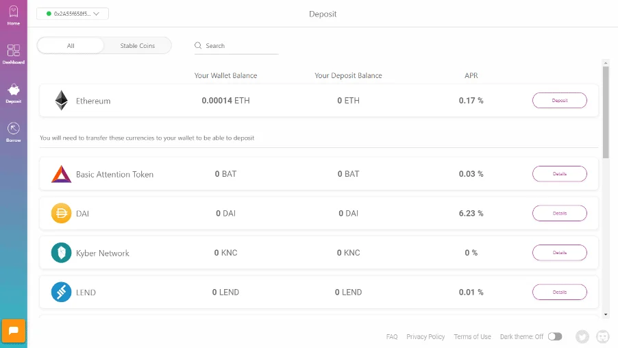 Depositing is easy, just simply pick your desired asset in which to invest and then allow Aave access to the asset. Once the transaction is processed, and the interest rate is confirmed you can check the rate changes on the Aave app. The interest-earning tokens are called aTokens which are similar to Compound’s C tokens.