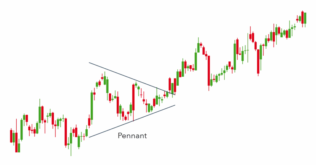 Pennants can be either bullish or bearish, and they can represent a continuation or a reversal. The picture above is an example of a bullish continuation.