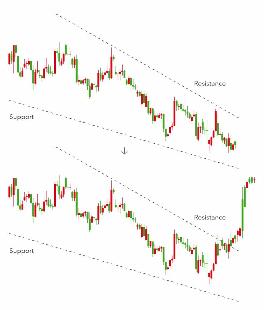 It may seem like a downward trend but it isn’t. In fact, it is a reversal pattern. A falling wedge is usually indicative that an asset’s price will drop before it rises and breaks through the level of resistance, as shown in the second picture above.