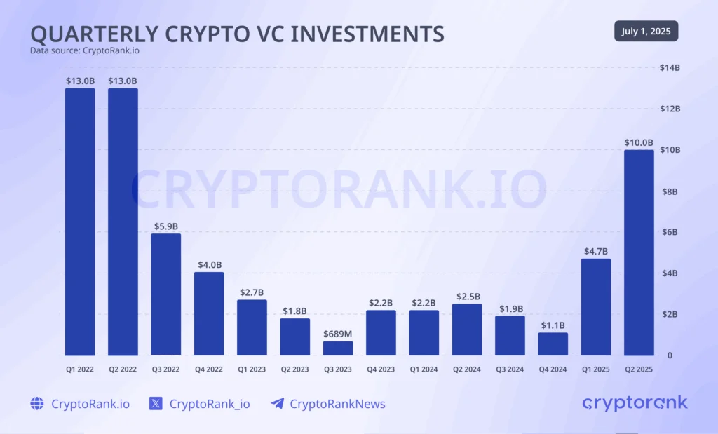 According to CryptoRank’s Q2 2025 report, crypto fundraising experienced a significant surge, reaching levels not seen since the bull market of the previous cycle. For the first time in three years, quarterly crypto VC investments exceeded $10 billion. This sharp increase began at the start of 2025, following the arrival of a new White House administration and a more crypto-friendly policy agenda.