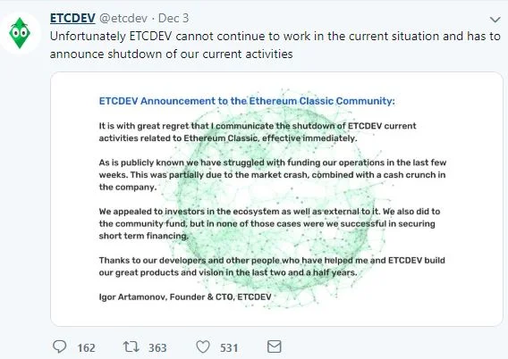 ETCDEV, the leading Ethereum Classic development company stopped all development and shut down completely. Its founder and tech-lead Igor Artamonov stated in a tweet that ETCDEV can no longer keep afloat. Whilst this is a strong blow to the Ethereum Classic (ETC) community, the price of ETC has not plummeted to zero – there are other development teams at work on this decentralized project