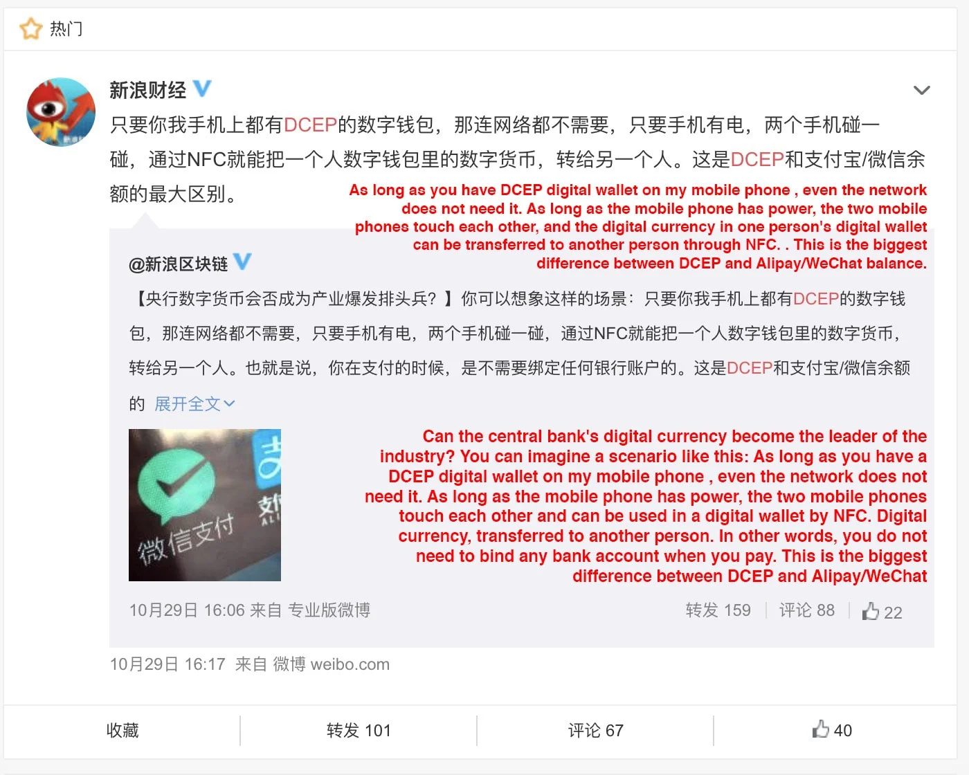 According to Official Sina Blockchain, DCEP will have NFC based payment options that don’t require devices to be online during the transfer. This will be poised as a direct replacement of paper money, as DCEP will be usable in areas without internet coverage. In addition, DCEP doesn’t require the mobile device to be bound to a bank account – meaning the unbanked population will also have access to the digital currency.