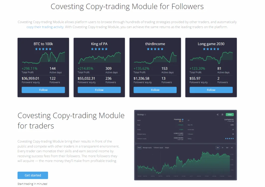 Covesting module: Prime XBT seamlessly interacts with Covesting, a different cryptocurrency social trading platform that enables you to follow and automatically imitate the trades of experienced traders.