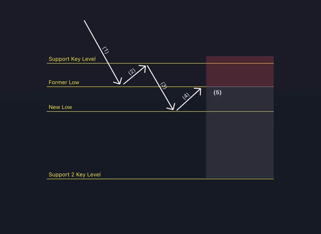 - Entry at former low and place stop loss above key level, targeting the next key level