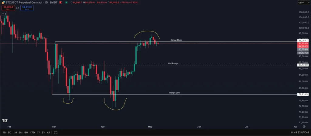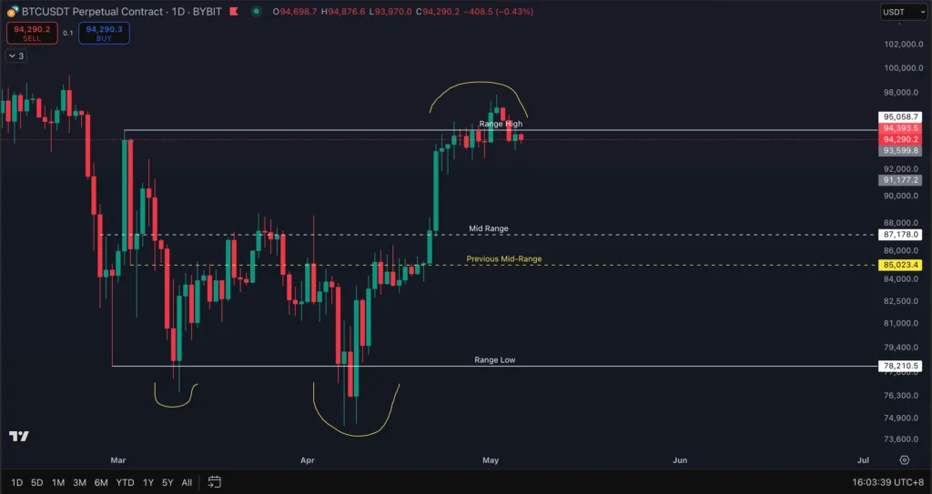 Mid-Range ($87,178): The middle of this range, around $87,178, saw choppy price action. It primarily acted as a “mini resistance” from March 7 to April 20 where price rejects every time it retested $87,178. But on April 21, the daily candle closed above the mid-range which showed buying strength, and the following day BTC pumped to as high as $94,000 after retesting the mid-range on market open. From there on, the mid-range acts as a support if price reverses from the range high. This is also known as a higher time frame (HTF) support/resistance (S/R) flip region, as it’s significant on both 4-hour and daily charts.