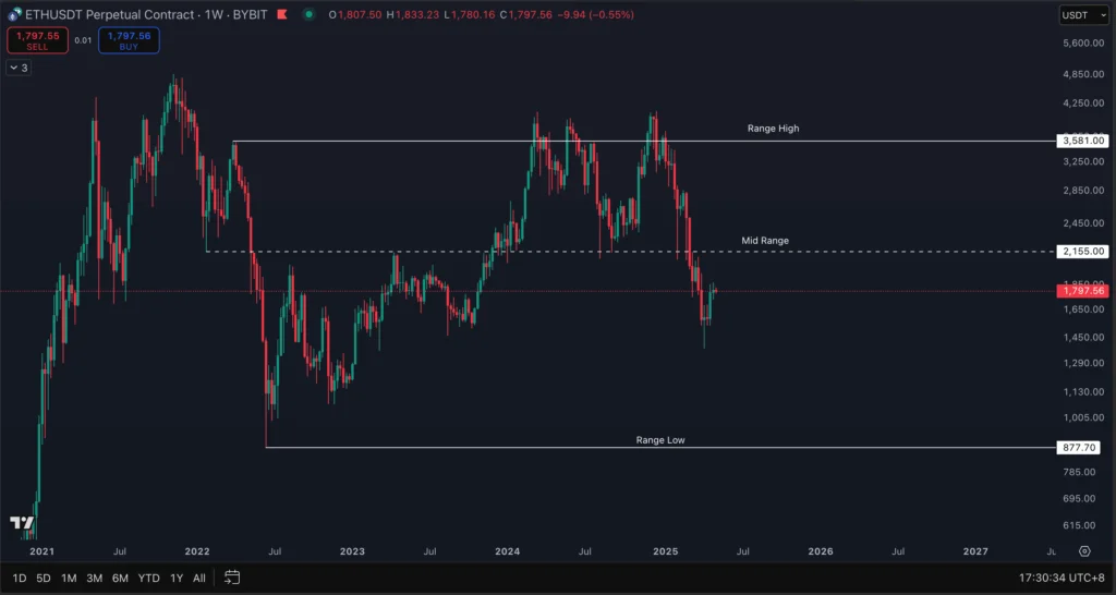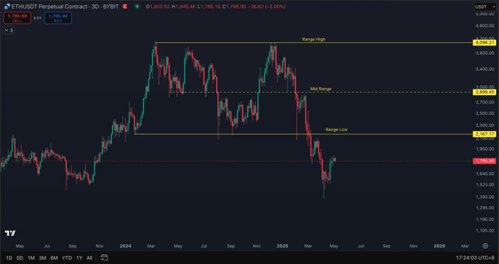 From January 22, 2024 to March 3, 2025, ETH was trading in a range between $2,167.17 and $4096.21. For the longest time, the range low held strongly as an HTF support – price had bounced sharply from the range low 3 times. But on March 9, 2025, price has completely broken below the range low and failed to reclaim it the following week. This means the yellow-lined ranges are no longer in play.